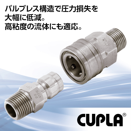 迅速流体継手「TSPカプラ」 バルブレス構造で大流量を実現した中圧用「カプラ」です。 粘度の高い流体に適しています。